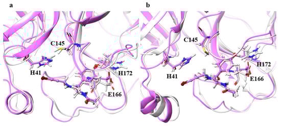Structures around the ligand in the (a) A and (b) B chains. Atoms and chains of wild type and H172A are presented in white and magenta, respectively. The ligand is represented by the ball-and-stick model, and H41, C145, E166, and H172 are represented by the stick model.