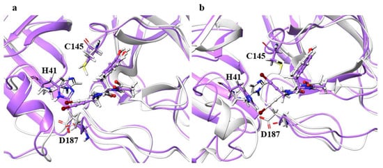 Structures around the ligand in the (a) A and (b) B chains. Atoms and chains of wild type and D187A are presented in white and purple, respectively. The ligand is represented by the ball-and-stick model, while H41, C145, and D187 are represented by the stick model.