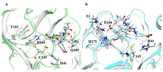 Structures around the ligand in the B chain. (a) Superimposition of the wild type and H163A around the ligand. Only the B chain is illustrated. Atoms and chains of wild type and H163A are presented in white and light green, respectively. The ligand is represented as a ball-and-stick model, and H41, C145, Y161, H163, and Q189 are represented by the stick model. (b) Superimposition of the wild type and E166A. Both A and B chains are illustrated. Atoms and chains of wild type and E166A are presented in white and cyan, respectively. Ligands are represented by the ball-and-stick models, and S1, H41, Cys145, E166, and H172 are represented by stick model. Of these residues, Only S1 belongs to the A chain, and the other residues belong to the B chain.