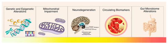 Currently, there are no effective tools to prevent PD onset, as there is no method of detecting the disease in its early stages or that can accurately inform the risk of disease progression. Consequently, further studies are needed to determine molecular factors that can be used as disease-specific biomarkers in preventive medicine (Figure 1). These can assist in the detection of PD before the onset of motor symptoms or in cases where the symptoms presented by the patient are insufficient for an accurate diagnosis. In addition to allowing an increase in the accuracy in the diagnosis process, these biomarkers could also differentiate PD from other forms of parkinsonism and other neurodegenerative diseases [6]. With this, many studies have explored the role of different genetic and epigenetic alterations, as well as alterations in the gut microbiome that may be involved in PD onset and progress, aiming to identify PD biomarkers and novel therapeutic targets.