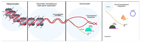 MicroRNAs (miRNAs) are a class of 21-nucleotide long molecules, distributed in a wide range of organisms [102,103,104]. They are known for their role in post-translational gene silencing in which they are loaded into Argonaut proteins, forming RNA-induced silencing complexes (miRISC) to mediate the degradation of the target messenger RNA (mRNA). In human cells, most of the canonical miRNAs are transcribed from intronic sequences of coding and non-coding regions, although there are miRNAs encoded from exons [103]. Additionally, many miRNA loci are in close proximity, forming clusters, and miRNAs within the same cluster are usually co-transcribed, although some might be suppressed depending on cellular necessity [103].