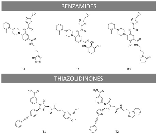 Chemical structures of LMW ligands used in the study. B1, B2, B3 are Benzamide derivatives; T1 is a Thiazolidinone derivative, and T2 is an antagonist obtained by chemically modifying T1.