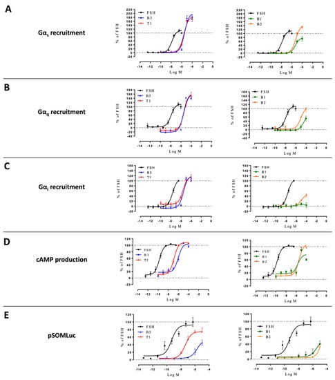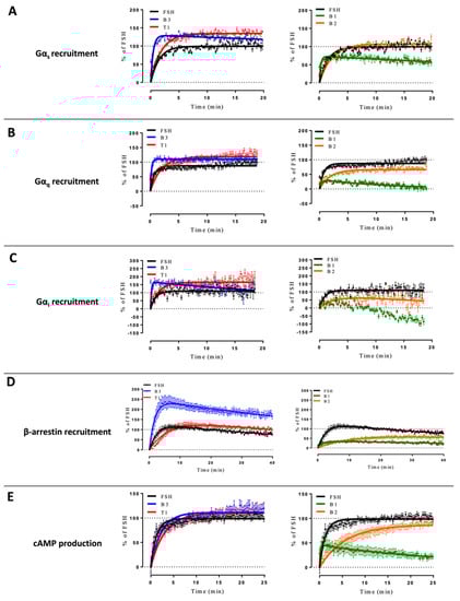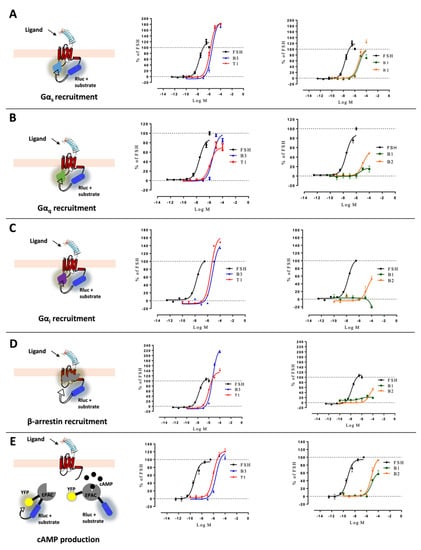 We first assessed the specificity of the effects mediated by B1, B2, B3, and T1. Mock transfected HEK293 cells treated with either LMW ligand or FSH showed no cAMP response, while forskolin led to a significant increase in cAMP (Supplementary Figure S1A). In HEK293 cells expressing FSHR, cAMP response induced by either FSH or LMW ligands could be antagonized using a previously validated antagonist (T2, Figure 1; Supplementary Figure S1B–F) []. We next analyzed the recruitment of Gαs, Gαq, Gαi, and β-arrestin 2 to FSHR using Bioluminescence Resonance Energy Transfer (BRET). This technique allows monitoring protein-protein interaction by virtue of changes occurring in the energy transfer between a donor (Renilla luciferase) and an acceptor (fluorescent protein) when both are close enough (~10–100 angstroms) to generate a signal. Additionally, we assessed cAMP production using an intramolecular BRET sensor (both the donor and the acceptor are fused to a cAMP binding domain) that undergoes a conformational change, hence BRET change, upon cAMP binding. HEK293 cells expressing FSHR were challenged with increasing concentrations of FSH or LMW ligands over a 30 min period. Kinetics were generated for each concentration (Supplementary Figure S2), and the area under the curves was plotted as a concentration/activity sigmoid (Figure 2). We normalized each concentration/activity curve with respect to the FSH maximal response, as described in the materials and methods. As shown in Figure 2, LMW ligands displayed distinctive pharmacological profiles. Overall, small molecules were significantly less potent compared to FSH in all assays, as shown by the EC50 comparison (Supplementary Table S1). Interestingly, B3 and T1 displayed significantly higher Emax than FSH for the Gαs and Gαi subunit recruitment (Figure 2A,C), whereas they were both full agonists for Gαq recruitment (Figure 2B). In contrast, B1 and B2 behaved as full agonists for Gαs but as partial agonists for Gαq recruitment (Figure 2A,B). For Gαi recruitment, B1 was neutral with a slightly inverse agonism at the very high concentration, whereas B2 was a partial agonist (Figure 2C). Measurement of β-arrestin 2 recruitment revealed striking differences: T1 displayed full agonism, B1 and B2 behaved as weak partial agonists, whereas B3 recruited β-arrestin 2 with an almost two-fold higher Emax (231.8 ± 4.9) compared to FSH, qualifying as a super-agonist for β-arrestin 2 recruitment (Figure 2D). For cAMP production, no major differences in Emax were found compared to FSH, except for B1 displaying partial agonism (Figure 2E).