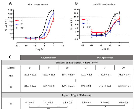 Concentration/activity curves of T1 vs. FSH at different time points. Gαs recruitment (A) and cAMP production (B) were measured at 2, 7, and 20 min of stimulation. Efficacies and potencies were compared (C). The area under the concentration/activity curves generated by T1 at the different endpoints considered (2, 7, and 20 min) were calculated. FSH maximal response at each endpoint was set at 100%, and T1-induced values were normalized accordingly. Normalized values were plotted and fitted using non-linear regression. Emax values were represented as the % of FSH Emax ± SEM. Potency values were represented as the positive logarithm of the ligand EC50 concentration ± SEM for each time considered. Statistical significance was assessed by unpaired t-test with Welch’s correction. n = 6, * p < 0.05; *** p < 0.001.