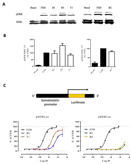 We next assessed the effect of each LMW ligand on two integrated cellular responses: (i) extracellular signal-regulated kinase (ERK1/2) phosphorylation, assessed by Western blot, and (ii) cAMP-responsive element (CRE) transcription using a reporter gene (Figure 5). ERK1/2 phosphorylation levels were evaluated after stimulating FSHR-transfected HEK293 cells for 5 min with EC80 of each compound (Supplementary Figures S3 and S4) and were normalized over total ERK. The 5 min time corresponded to the peak of phosphorylated ERK activation in our cellular settings, as previously described [,]. As shown in Figure 5, FSH and LMW ligands induced ERK phosphorylation compared to basal. Interestingly, B3 induced a higher level of ERK phosphorylation than the other LMW ligands and FSH. The Gαs/cAMP/PKA pathway is canonically activated upon FSH binding to the receptor. In particular, the second messenger cAMP binds to PKA, which, in turn, activates the cAMP response element-binding protein (CREB) in the nucleus. CREB is a transcription factor that binds to the cAMP response element (CRE) of the promoters of its target genes and leads to their activation. In this context, we were interested in analyzing the impact of LMW ligands on the FSHR-mediated Gαs/cAMP/PKA-dependent gene expression. To do this, CRE-dependent transcription was assessed after 6 h of stimulation using luciferase as a reporter gene. The data revealed striking differences compared to Gαs recruitment and cAMP production. B3 and T1 were partial agonists compared to FSH, whereas B1 and B2 displayed very poor potencies, inducing weak luciferase expression only at high concentrations (Figure 5C; Supplementary Table S4).