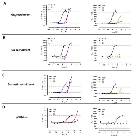 Given the biased properties of the different LMW ligands in our panel, one can wonder what effects they would have on reproduction. For example, the selective activation of a specific FSHR-mediated signaling pathway by a biased compound may enhance the ovulation output in ART while reducing the risk for OHSS. In a similar way, such biased properties may contribute to dissect the molecular mechanism leading to reproduction-related disorders. Interestingly, T1 was already tested in immature rats. Despite good potency and efficacy in vitro, serum T1 was undetectable in vivo. Effects on ovulation were achieved only when T1 was continuously perfused with a pump. Moreover, some genotoxic effects were reported []. On the contrary, B1, B2, and B3 were not yet evaluated in vivo. Other benzamide derivatives from the same series were tested in immature rats. They displayed acceptable pharmacokinetic parameters but were not tested for their effects on ovulation []. In this context, evaluating B1, B2, and B3 in vivo could help decipher the respective contributions of G proteins and β-arrestin on reproduction, thereby assessing the potential of FSHR-targeted biased drugs for clinical applications in the field of reproductive medicine.