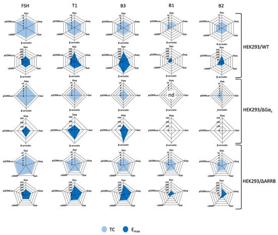 Radial graph representation of FSH and LMW ligand-induced transduction coefficients (TC) and maximal efficacies (Emax). Transduction coefficients and maximal efficacies were obtained after curve-fitting of FSH and LMW ligand-induced concentration/activity curves and are represented as radial graphs. Radius for TC is in logarithmic scale while radius for Emax is normalized, considering FSH maximal response as 100%, and is shown in linear scale. B1-induced transduction coefficients in HEK293/ΔGαs were not identifiable, and the relative radial graph was labeled as “not determined” (nd).