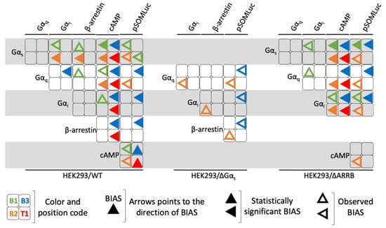 Graphic representation of the biased pharmacological behavior induced by LMW ligands. The biased pharmacological behavior of each LMW (represented in a color code, B1 = green, B2 = orange, B3 = blue and T1 = red) ligand is represented in the shape of an arrow pointing to the direction of bias for each of the pair of read-outs considered in the three cellular contexts. Statistically significant biases (full arrow) as well as observed biases (empty arrow) are shown.