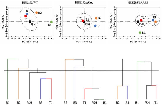 To better discriminate pharmacological efficacies of FSH and LMW ligands across the multiple dimensions in the three cellular models explored, we performed principal component analyses (PCA) using the calculated bias values. Since FSH was the reference ligand, all the values entered for FSH in the PCAs were set to 0, meaning no bias. In all three PCAs shown in Figure 10, the two principal components, PC1+PC2, accounted for 91.44 to 99.14% of the variability across the ligands, hence highlighting differences in ligand behavior. Furthermore, we performed hierarchical clustering based on the PCA results to group ligands in clusters (Figure 10). Interestingly, ligands did not group in the same clusters (dotted lines) in the different cellular models, suggesting that the gene knockouts and the associated compensatory rewiring [] led to system biases. In wild-type HEK293, B3, FSH, and T1 were clustered together; B1, T1, and FSH were in the same cluster in HEK293/ΔGαs, whereas two separate clusters, composed by B3 and B2 (left cluster) and by FSH and T1 (right cluster), were found in HEK293/ΔARRB. The apparent superposition of B1 and FSH in HEK293/ΔGαs was clearly misleading and is not at all indicative of pharmacological equivalence of these two ligands in this cellular system. Instead, it reflects the fact that FSH, being the reference, had no bias in any of the cellular systems (hence all values = 0), yet it clearly triggered robust responses for all read-outs measured in HEK293/ΔGαs. On the contrary, B1 displayed no activity at all in HEK293/ΔGαs, hence, no bias (all values = 0). This is an illustration of the type of caveats that can arise when running such systematic bias analyses.