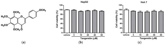 Before the examination of molecule’s regulating effect, we need to be sure that it does not have detrimental effects in tested cells; thus, we examine the cytotoxic effect of tangeretin (Figure 1a) on hepatic cells. HepG2 and Huh-7 cells were incubated with the vehicle (0.1% DMSO) or tangeretin (5, 10, 20, 40, and 60 μM) for 24 h, and the viability of the cells was measured by MTT assay. As shown in Figure 1b,c, compared with the vehicle, tangeretin (5–60 μM) induced no significant cytotoxicity in HepG2 and Huh-7 cells.