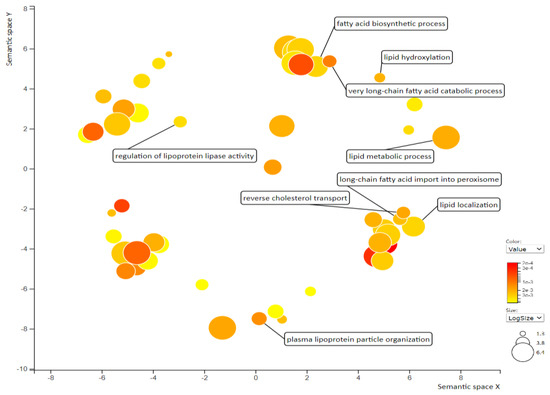 Transcriptome analysis is a valuable method to elucidate molecular changes in response to chemical agents for making decisions in the early stage of drug discovery [39]. Thus, to investigate the potential genes involved in the tangeretin-mediated regulation of TGRLs and dyslipidemia, we examined the differentially expressed genes (DEGs) in tangeretin-treated hepatic cells by human genome-wide microarray analysis. The entire set of significant DEGs (p < 0.05) in tangeretin-treated cells was subjected to functional annotation with Gene Ontology (GO) term enrichment analysis to determine the biological processes (BPs) in which they are involved. Supplementary Table S1 shows the 50 GO BP terms with the most significant p values. Furthermore, REVIGO was performed to summarize the long lists of GO terms on the basis of semantic similarities to visualize nonredundant GO annotations for interpretation. It was found that lipid modulation-related BPs, such as plasma lipoprotein particle organization, reverse cholesterol transport, lipid metabolic process, lipid hydroxylation, fatty acid biosynthetic process, lipid localization, and regulation of lipoprotein lipase activity, were significantly changed in the tangeretin-treated cells (Figure 2).