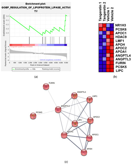 Pathway enrichment, GSEA, and prediction of protein–protein interactions for DEGs in response to tangeretin treatment. The differentially expressed genes (DEGs) in tangeretin-treated HepG2 cells were analyzed by a human genome-wide microarray as described in the Materials and Methods. (a) Gene set enrichment analysis (GSEA) demonstrates that the GO BP signature “Enrichment plot: GO BP Regulation of Lipoprotein Lipase Activity” (GO:0051004) gene set is enriched with the DEGs of tangeretin-treated cells. The barcode plot represents the position of the genes in the gene set. The horizontal bar in graded color from red to blue indicates positive and negative regulation by tangeretin. The vertical axis in the lower plot indicates the ranked list metric. (b) The DEGs in the gene set of GO:0051004 in response to tangeretin (40 μM) treatment. (c) Predicted protein–protein interaction for tangeretin-downregulated genes associated with regulation of LPL activity. The corresponding genes were uploaded to the STRING interaction database. Disconnected nodes were omitted, and line thickness indicates the strength of the data supporting the connections.
