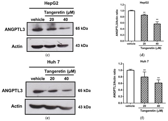 The effect of tangeretin on ANGPTL3 expression in HepG2 and Huh-7 cells. HepG2 and Huh-7 cells were treated with vehicle (0.1% DMSO) or tangeretin (20 and 40 μM) for 24 h. The mRNA expression of ANGPTL3 in (a) HepG2 and (b) Huh-7 cells was measured by RT-Q-PCR analysis. The data represent the mean ± SD of three independent experiments. The ANGPTL3 proteins in HepG2 and Huh-7 cells were determined by Western blot analysis. (c,e) Representative blots are shown. (d,f) The normalized intensity of ANGPTL3 versus actin protein is presented as the mean ± SD of three independent experiments. ** p < 0.01 indicates significant differences compared to the vehicle-treated cells.
