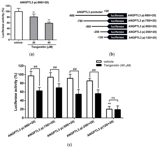 The effect of tangeretin on ANGPTL3 promoter activity. (a) HepG2 cells were cotransfected with an ANGPTL3 promoter–reporter plasmid (ANGPTL3 p(−980/+20)) and a Renilla control plasmid for 24 h. The cells were then treated with vehicle (0.1% DMSO) or tangeretin (20 and 40 μM) for 24 h. The luciferase activities were measured and normalized to their respective Renilla luciferase activities. The data represent the mean ± SD from three independent experiments. ** p < 0.01 indicates significant differences compared to the vehicle-treated cells. (b) Reporter plasmids containing serially deleted DNA fragments of the ANGPTL3 promoter. (c) HepG2 cells were cotransfected with serially deleted ANGPTL3 promoter–reporter plasmids and a Renilla plasmid for 24 h and then treated with vehicle or tangeretin (40 μM) for an additional 24 h. The luciferase activities were measured and normalized to the respective Renilla luciferase activity. The data represent the mean ± SD of three independent experiments. ** p < 0.01 indicates a significant difference compared to vehicle-treated ANGPTL3 p(−980/+20) plasmid-transfected cells. ## p < 0.01 indicates significant differences compared to the respective vehicle-treated cells. “ns” indicates no significance.