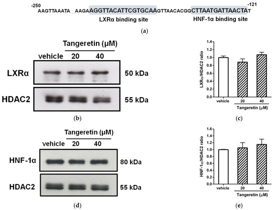 As shown in Figure 7a, the sequence between nucleotides −250 and −121 within the ANGPTL3 promoter in response to tangeretin was analyzed. Within this DNA region, regulatory elements for the interaction of two putative transcription factors, LXRα (−163 to −147) and HNF-1α (−136 to −122), have been reported to be involved in the regulation of ANGPTL3 gene expression in hepatocytes [43,44]. To determine whether these two transcription factors are involved in the tangeretin-mediated downregulation of ANGPTL3, the effect of tangeretin on the levels of nuclear LXRα and HNF-1α proteins was determined. As shown in Figure 7b–e, when cells were treated with tangeretin, the amounts of nuclear LXRα and HNF-1α proteins were not significantly changed in HepG2 cells.