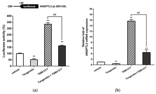 Effects of tangeretin on ANGPTL3 transcription upon T0901317-induced LXRα activation in HepG2 cells. (a) HepG2 cells were cotransfected with an ANGPTL3 promoter–reporter plasmid (ANGPTL3 p(−250/+20)) and a Renilla control plasmid for 24 h. These plasmid-transfected cells were pretreated with vehicle or tangeretin (40 μM) for 1 h followed by treatment with T0901317 (1 μM) for an additional 24 h. The luciferase activities were measured and normalized to their respective Renilla luciferase activities. The data represent the mean ± SD from three independent experiments. (b) HepG2 cells were pretreated with vehicle or tangeretin (40 μM) for 1 h followed by treatment with T0901317 (1 μM) for an additional 24 h. The mRNA levels of ANGPTL3 were measured by RT-Q-PCR analysis. ** p < 0.01 indicates a significant difference compared to vehicle-treated cells. ## p < 0.01 indicates significant differences compared to the T0901317 alone-treated cells.