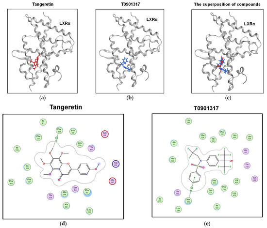 Tangeretin can dock into the ligand-binding domain of LXRα. The poses of tangeretin and T0901317 docked preferentially to the ligand-binding domain of LXRα. LXRα is shown as a gray ribbon, and the compounds are shown in (a) red (tangeretin) and (b) blue (T0901317). (c) The superposition of both tangeretin and T0901317 docked to the ligand-binding pocket of LXRα. Two-dimensional interaction map of LXRα with (d) tangeretin and (e) T0901317. The hydrophobic and hydrophilic amino acid residues near the compounds are colored green and pink, respectively.