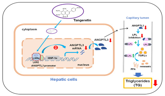The lipid-lowering effects of citrus tangeretin on the regulation of dyslipidemia have been reported in numerous studies. To our knowledge, this is the first report to show that tangeretin inhibits the gene expression of hepatic ANGPTL3 via counteracting the activity of LXRα, a key regulator for lipid homeostasis. The decreases in intracellular and secreted ANGPTL3 proteins by tangeretin may augment LPL catalytic activity during the hydrolysis of TGs in lipoproteins, resulting in a reduction of TG accumulation in circulation (Figure 10).