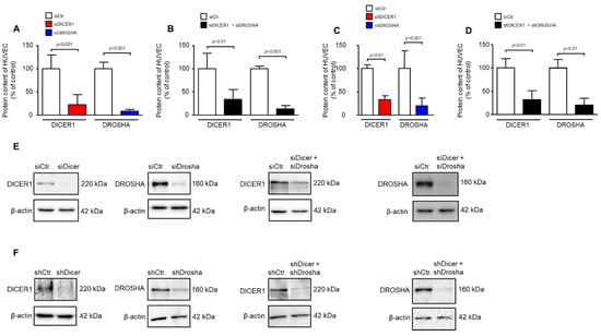 We used transient siRNA or lentiviral stable shRNA delivery to HUVEC to achieve knockdown of DICER1, DROSHA or DICER1 and DROSHA. As determined by real-time PCR analyses, shRNA directed against DICER1 led to a significant reduction in HUVEC DICER1 mRNA content (27.9 ± 12.9%) vs. non-targeting shRNA control (100 ± 35.5%, p < 0.05, n = 3 biological replicates from independent transductions, Supplemental Figure S1). This was also the case, but only as a non-significant trend, with shRNA directed against DROSHA (45.1 ± 8.9%) as compared to non-targeting shRNA control (100 ± 52.7%, p = 0.15, n = 3 biological replicates from independent transductions, Supplemental Figure S1). We therefore subsequently investigated the more important effects of RNAi treatment on protein levels of DICER1 and DROSHA in HUVEC. As determined by Western Blot analyses, siRNA directed against DICER1 led to a significant reduction in HUVEC DICER1 protein content (22.4 ± 21.4%) vs. non-targeting siRNA control (100 ± 29.3%, p < 0.001, n = 5–6 biological replicates from independent transfections, Figure 1A,E). In addition, siRNA-mediated knockdown of DROSHA significantly reduced the content of this protein in HUVEC (8.4 ± 4.0%) as compared with a non-targeting control (100 ± 13.5%, p < 0.001, n = 6 biological replicates from independent transfections, Figure 1A,E). Moreover, simultaneous knockdown of both DICER1 and DROSHA was achieved with a similar efficacy when both siRNA mixtures were used (Figure 1B,E). In a second approach, stable knockdown of DICER1 and/or DROSHA was induced by lentiviral delivery of specific shRNAs or non-targeting shRNA control. In this approach, DICER1 knockdown led to a significant reduction in HUVEC DICER1 protein content (33.0 ± 19.3%) as compared with non-targeting shRNA control (100 ± 20.2%, p < 0.01, n = 5–6 biological replicates from independent transductions, Figure 1C,F). In addition, shRNA-mediated knockdown of DROSHA significantly reduced the content of this protein in HUVEC (19.5 ± 16.4%) as compared with non-targeting control (100 ± 38.4%, p < 0.001, n = 9 biological replicates from independent transductions, Figure 1C,F). Again, simultaneous knockdown of both DICER1 and DROSHA was achieved with a similar efficacy when both shRNAs were used (Figure 1D,F). In each experiment, a small fraction of cells was taken for analyses to verify knockdown at the protein level. Only those experiments were used for analysis in which significant knockdown of DICER1 and DROSHA was detected.