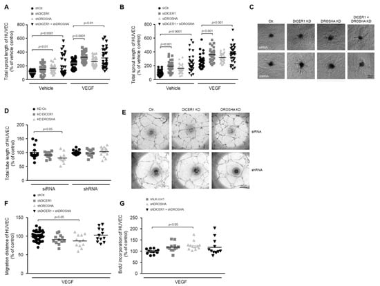 Impact of RNAi-mediated knockdown of DICER1 and/or DROSHA on the angiogenic capacity of HUVEC in vitro. RNAi-mediated knockdown of DICER1 as well as DICER1 and DROSHA using either specific shRNA (A,C); n = 30–52) or siRNA (B,C); n = 29–30 biological replicates derived from at least three independent sets of experiments) increases basal and VEGF-induced sprouting from HUVEC spheroids in vitro. Data are depicted as scatter plots and mean. (C) Representative microscopic pictures of VEGF-induced (20 ng/mL) HUVEC spheroid sprouts. RNAi-mediated knockdown of DROSHA but not DICER1 using either specific shRNA or siRNA may slightly decrease HUVEC migration (F); n = 12–36 biological replicates derived from at least three independent sets of experiments) and tube formation (D,E); n = 12–15 biological replicates derived from at least three independent sets of experiments), although the siRNA-related knockdown effect on the tube formation capacity of HUVEC could not be observed in HUVEC, in which DROSHA knockdown was performed using shRNA (D). (E) Representative microscopic pictures of HUVEC tubes. (G) shRNA-mediated knockdown of DROSHA but not DICER1 moderately increases BrdU incorporation of HUVEC (n = 12 biological replicates derived from at least three independent sets of experiments).
