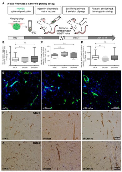 The in vivo endothelial spheroid grafting assay was carried out as described by Laib et al. []. HUVEC were transduced with lentiviral vectors to express specific shRNA directed against DICER1 or DROSHA or to express non-targeting shRNA control. Subsequently, spheroids of transduced HUVEC were generated using the hanging drop method. Endothelial spheroids were then embedded into a matrix containing endothelial growth medium, methocel, fibrinogen, growth factors (VEGF-A, bFGF) and high concentration matrigel (Corning). This suspension was injected subcutaneously into the ventral region of NSGTM mice. For explantation of plugs, mice were sacrificed 21 days after injection. Plugs were immediately fixed in 4% formaldehyde and finally embedded in paraffin following standard protocols. Three 8 µm thick sections were sliced from different levels of the plug and humanoid neovessels were stained using fluorescently labelled Ulex Europaeus Agglutinin I (UEA I, Vector Laboratories, Burlingame, CA, USA) and analyzed morphometrically. For this purpose, eight images were acquired from each section and then analyzed using the Nikon NIS elements software. The values obtained in this way for the different images of the different sections of each plug were then averaged so that only one value was obtained for each plug and each parameter (blood vessel area, blood vessel density, average blood vessel size). In addition, phenotypic characterization of the vascular network derived from HUVEC was performed by immunohistochemistry using antibody labelling of human endothelial cell markers CD31 (Cell Signaling Technology; clone 89C2; 1:750) and CD34 (Thermo Fisher Scientific; clone QBEnd/10; 1:500). HRP-conjugated secondary antibodies were used as described by the manufacturer (Cell Signaling Technology, HRP-Rabbit (#8114); HRP-mouse (#8125)). For staining, we used the DAB-substrate kit according the manufacturer instructions (Cell Signaling Technology, #8059). Computer-aided histomorphometric analyses of humanoid neovessels were made using the NIS elements software package (Nikon).