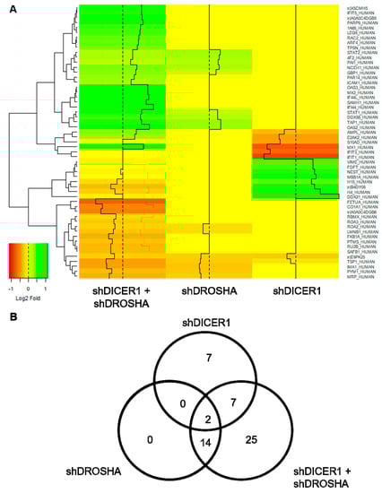 To assess the effect of DICER1 and DROSHA on HUVEC protein expression, we performed unbiased global proteome analyses 72 h after stable lentiviral shRNA delivery to HUVEC to achieve permanent knockdown of DICER1, DROSHA or both DICER1 and DROSHA. In these analyses, only a low number of differentially expressed genes were identified (Figure 4). Compared with non-targeting shRNA control, both knockdown of DICER1 and knockdown of DROSHA induced deregulation of 16 proteins (Figure 4B), respectively. Moreover, simultaneous knockdown of DICER1 and DROSHA induced deregulation of 48 proteins, although knockdown-associated changes in protein content were consistently moderate to negligible in nature. However, interestingly and in contrast to a previous publication [], we observed a reduction in the expression level of the angiogenesis inhibitor thrombospondin-1 (TSP-1) in DICER1, DROSHA and even more pronounced in DICER1 and DROSHA knockdown HUVEC, suggesting that both DICER1 and DROSHA regulate TSP-1 expression in HUVEC. In addition, we observed decreased expression of a non-muscle isoform of cofilin-1 (E9PK25) after knockdown of DICER1, DROSHA, and DICER1 + DROSHA. Cofilin-1 regulates actin polymerisation and appears to play an important role in cell motility, cell morphology, and cell division, which may contribute to the observed endothelial phenotype of knockdown of DICER1 and/or DROSHA on the angiogenic capacity of HUVEC. In contrast to the downregulated proteins mentioned above, STAT1 (signal transducer and activator of transcription 1), a known negative regulator of angiogenesis, which functions as a signaling protein and transcription factor, was upregulated by DROSHA as well as by DICER1 + DROSHA knockdown, whereas, in contrast, singular knockdown of DICER1 had no effect on STAT1 expression.