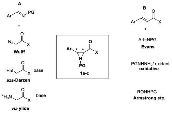 Authors of previous reviews have summarized the recent advances in the synthesis of aziridine-2-carbonyl compounds (Zalubovskis and Ivanova [7]) and in the overall aziridine chemistry and synthesis (Singh [8] and Luisi [9]). The generally known methods to obtain these compounds include aziridination, Gabriel-Cromwell cyclization of aminoalcohols, Diels-Alder cycloaddition to azirines, Baldwin rearrangement, and others. This review is focused on synthesizing 3-aryl substituted aziridines 1a–c (Scheme 1) via aziridination since aziridination has a wide perspective, especially in stereoselective synthesis; it is tolerant towards various functional groups and can be realized in mild conditions which are important for construction of more complex molecules. The structures 1a–c (Scheme 1) have two asymmetric carbons in 2(α-) and 3(β-) positions of aziridine ring, and therefore stereoselectivity of synthetic methods is important. Aziridination has two variations: carbon addition to the imine double bond via carbene sources (Scheme 1A) and nitrogen addition to the olefin double bond via nitrene sources (Scheme 1B).