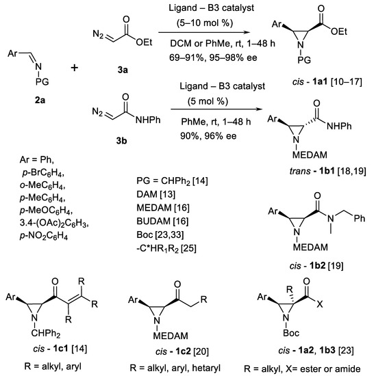 Control of diastereo- and enantioselection of chiral VAPOL/VANOL-based polyborate Brønsted acid catalyst-based AZ reactions has been studied [18,19]. In case of diazoamide 3b, trans aziridines (Scheme 2; 1b) can be obtained in reasonably high yields (90%) and enantioselectivity reaching 96% [18]. MEDAM group is the best imine 2a (Scheme 2) N-substituent in this reaction. Also, cis aziridine amides 1b (Scheme 2) are obtained if the amide group is more sterically hindered [19]. Product stereochemistry-determining transition states have been studied both experimentally and in silico to obtain universal methodology of catalytic AZ reaction [19].