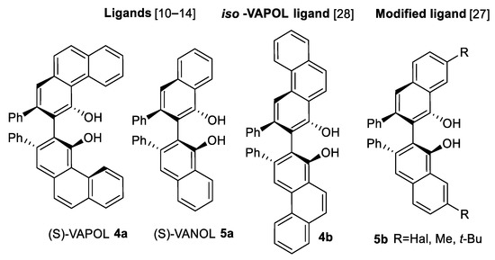 The further increase of AZ reaction enantioselectivity was realized through insertion of substituents in 7, 7′ positions of biaryl ligand 5b as depicted in the Scheme 3 [27]. Improving of catalyst ligand included developing of iso-VAPOL ligand 4b illustrated in the Scheme 3 [28]. This ligand was an isomer of VAPOL 4a (Scheme 3) but had a chiral pocket of VANOL 5a (Scheme 3) and was available from much cheaper starting materials.