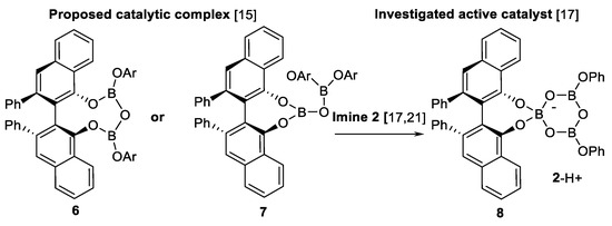 In the subsequent study [16], the active site of the aziridination catalyst “chemzyme” was explored using different N-substituents in the imine 2a (Scheme 2), and authors found that 3.5-dimethyldianisilmethyl (MEDAM) and 3.5-di-tert-butyldianisilmethyl (BUDAM) groups resulted in the best asymmetric inductions in AZ reaction. Further, evidence of cyclic self-assembled boroxinate Brønsted acid ion pair 8 (Scheme 4) acting as an active catalyst in the asymmetric AZ reaction has been reported [17].