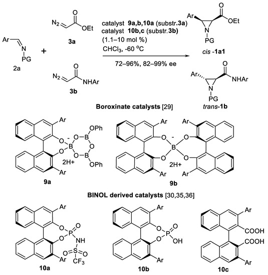 A series (12 examples) of esters cis-1a1 (Scheme 2) were obtained by Thurston’s group using BINOL-derived Brønsted acid catalyst 10a (Scheme 5) [30]. Multi-component variation of AZ reaction was carried out employing aromatic and heteroaromatic aldehydes. Other examples of multi-component AZ reaction approach involving the above mentioned VAPOL and BOROX catalysts are also known [31,32]. Optimal reaction protocol for aromatic aldehydes in synthesis of aziridines trans-1b (Scheme 2) was found [32].