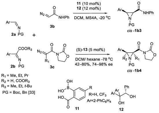 Another boron Brønsted acid catalyst system—arylboronic acid 11 and chiral diol ligand 12 in situ assembled boronate ester (Scheme 6) was developed by Maruoka and co-workers [33]. Aziridine amides cis-1b3 (Scheme 6) were obtained in good yields and high enantioselectivities (22 examples). In case of α-diazoacyl oxazolidinones 3c (Scheme 6) as carbene sources and chiral N-triflyl phosphoramide Brønsted acid catalyst 10a (Ar = Ph) [34] highly substituted oxazolidinone aziridine amides cis-1b4 (Scheme 6) were obtained in good (77–91%) chemical yields and usually >80% ee. Series of different 3–aryl substituents were demonstrated to be useful in these reactions in 24 examples. Reasonable trans-selectivity was reached in this type of reactions with chiral phosphoric acids 10b (Ar = 9-Anthryl) [35] and 10c (Ar = 2.4.6-Me3-C6H2; Scheme 5) [36] as a catalyst to obtain amides trans-1b3 in excellent yields (89–97%) and enantioselectivity (88–98%), shown in 16 examples [35] and 14 examples [36], respectively.