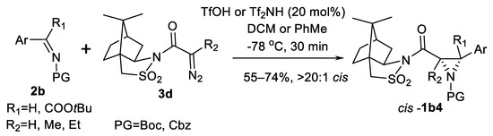 The use of a chiral diazonium compound (Scheme 8) represents an interesting asymmetric variation of AZ reaction [42,43]. Thus, N-α-diazoacyl camphorsultams 3d demonstrate good results in reaction with imines 2b to obtain β-mono- and disubstituted aziridine-2-carboxamides cis-1b4.