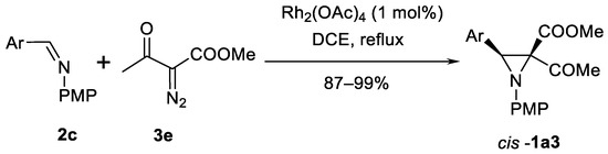 Diazoacetates 3e are useful substrates for synthesis of highly functionalized β-aryl aziridine ketoesters cis-1a3 as shown in the Scheme 9 [44]. Six successful examples with different arylimines were presented. Unfortunately, if Ar = p-NO2Ph, or 2-pyridyl, no reaction was observed. On the other hand, some examples of products cis-1a3 with another ester groups and 2.2-diesters instead of ketoester were demonstrated.