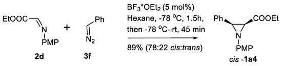 Other simple catalysts for imine C=N bound aziridination with diazo compounds include BF3*OEt2 [47,48], montmorillonite K-10 [49], LiClO4 [50] and Rh2(OAc)4 [44,51]. The Lewis acid BF3*OEt2-catalyzed reaction of imino ester 2d and phenyldiazomethane 3f produces the aziridine ester cis-1a4 in good yield [47] without enamino- and dimeric byproducts (Scheme 10).