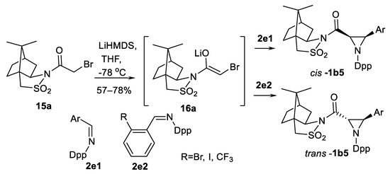 The sources of chirality are chiral N-substituents in imines or enolates. Use of chiral enolates and N-diphenylphosphinylimines were explored by Sweeney and co-authors [58,59]. Thus, enolate 16a, generated from 2R-N-bromoacethylcamphorsultam 15a (Scheme 12) reacts with N-diphenylphosphinyl aldimines 2e1 leading to 3-arylaziridine-2-carboxamides cis-1b5.