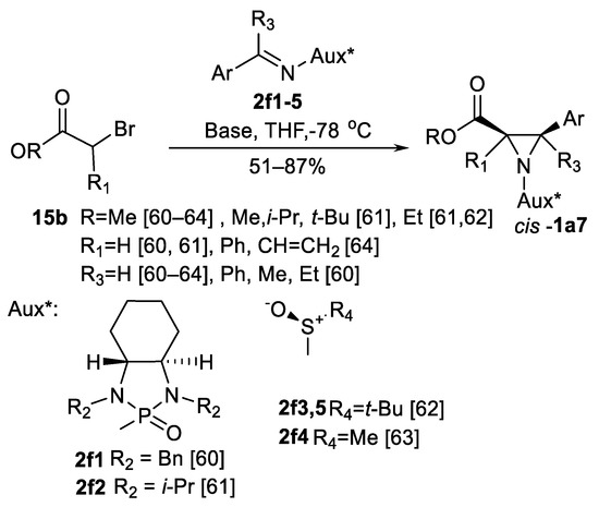 There are chiral N-phosphinyl imines 2f1, 2f2 [60,61] and chiral sulfimines 2f3, 2f4 [62,63,64] presented (Scheme 13). N-phosphinyl imines 2f1 have been successfully used in aza-Darzen reaction with enolates generated from esters 15b in ten examples of aziridines cis-1a7 in 72–82% chemical yields and >80% de [60]. Better results have been achieved by imines 2f2: 17 examples of aziridines cis-1a7 with various 3–aryl substituents and four examples of different esters 1a7 (Ar = Ph) have been obtained in good chemical yields (51–87%) and >98% cis- selectivity [61]. Chiral tert-butanesulfinyl aldimines 2f3, 2f4 and ketimines 2f5 were used in series of aziridines cis-1a7 synthesis [62]. Corresponding 3-aryl and 3.3-diaryl products were obtained in moderately good cis-selectivity (71:29–98:2); eight examples of 3-aryl products cis-1a7 were demonstrated. Isolated examples of S-mesitylsulfinyl imines 2f4 have been employed in aziridine cis-1a7 synthesis [63]. Trisubstituted 3-aryl aziridine-2-carboxylates cis-1a7 were obtained from substituted 2-bromoesters 15b and tert-butane sulfinyl aldimines 2f3 [64] in >60% chemical yields and >98% de (five examples).