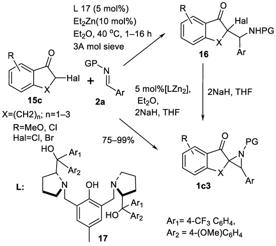 Modified aza-Darzen type protocol allows to obtain trisubstituted spirocyclic 3-aryl aziridinyl ketones 1c3 (Scheme 14) from cyclic halogenated ketones 15c illustrated in the Scheme 14 [65]. Two protocols—one-step direct approach to ketones 1c3 (Scheme 14) and two-step synthesis through an addition product, namely, tertiary halogenide 16 (Scheme 14)—were realized. Chloro- and bromoketones 15c (Scheme 14) were used, and the catalyst was Zn-ligand 17 (Scheme 14) complex. Reactions can be run in gram-scale with small amounts of catalyst. Chemical yields of products (30 examples) are 75–99% in >20:1 dr.