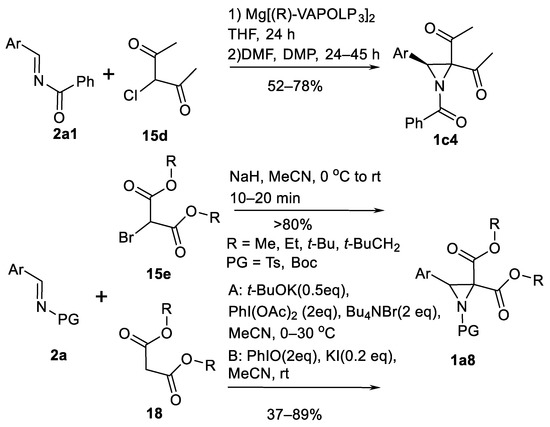 3-Arylated aziridine diesters 1a8 (Scheme 15) also can be prepared in aza-Darzen reaction [67]. Racemic aziridines 1a8 (Scheme 15) are obtained in >80% yields from imines 2a (Scheme 15) and bromomalonates 15e (Scheme 15). Useful N-substituent for these reactions was tosyl (24 examples) but N-Boc aziridine diester 1a8 (Scheme 15) also can be prepared from N-Boc imine 2a (Scheme 15). N-tosyl imines 2a (Scheme 15) can react with activated methylene compounds 18 (Scheme 15) in iodine (III) induced aziridinations to form aziridines 1a8 as shown in the Scheme 15 [68,69]. Iodobenzene diacetate—tetrabutylammonium bromide system was reported first [68]. Aziridines 1a8 (Scheme 15) can form from malonates 18 (Scheme 15), acetyl-, cyano- and nitroacetic acid esters to obtain symmetrical and unsymmetrical products 1a8 (Scheme 15) in 37–89% yields. The further study showed that PhIO-KI system is a better oxidative iodine (III) additive for these reactions [69]. In this case, aziridines 1a8 (Scheme 15) are obtained in >75% yields.