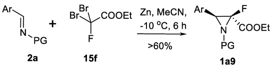 Reformatsky type aza-Darzen reaction variation using imines 2a, inactivated zinc metal and fluorodibromoacetate 15f is successfully used for access to 3-arylated 2-fluoro aziridine-2-carboxylates 1a9 as shown in the Scheme 16 [70].