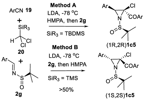 More complicated cascade reactions (Scheme 17) which allowed stereoselective obtaining of 3-arylated 2-chloro aziridines was demonstrated by Xu and co-authors [71]. This cascade coupling included nucleophilic addition of anion generated from silyldichloromethane 20 and nitriles 19 in presence of LDA and subsequent [1,3] -aza-Brooke rearrangement to give α-N-silyl imines in equilibrium with 1-azaenolate equivalents. These species were then trapped by imines 2g in an aza-Darzen type reaction to give aziridines 1c5 in good (up to 50%) yields and up to 10:1 selectivity demonstrated in 19 cases for each method. Remarkably, stereoselectivity strictly depends on the silyl group and the order of addition of 2g and HMPA (method A or B).