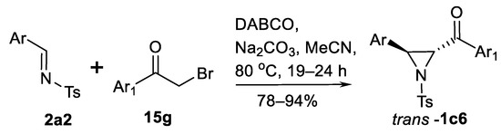 Other ylides can work in a similar way. Thus, aziridinations via ammonium [78,79,80] and sulfonium [81,82,83,84] ylides are known. A simple protocol for the reaction of phenacyl bromides 15g with imines 2a2 promoted by tertiary amine (DABCO) via in situ generated ylide (Scheme 19) has been reported [78].
