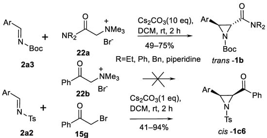 Simple trimethylammonium salts work similarly via amide-stabilized ammonium ylides (forming from salts 22a; Scheme 20) which react with aromatic aldimines 2a3 to form 3-arylated trans-aziridine carboxamides trans-1b [79]. Moderate to good yields and trans-selectivity has been demonstrated in eight examples. Remarkable feature is that ammonium salts 22b do not react with aldimines 2a2 in similar way. However, the classic aza-Darzen process—reaction of imines 2a2 with phenacyl bromide 15g—gives cis–aziridinyl ketones cis-1c6 in high yields.