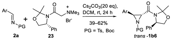 Asymmetric aziridination using stabilized trimethylammonium salts 23 has been demonstrated [80] in six examples (Scheme 21). Aziridine carboxamides trans-1b6 were obtained in good yields.