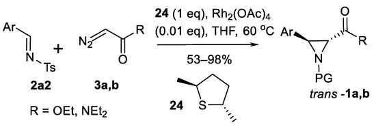 Chemical yields are good (57–78%) and stereoselectivity excellent, >95% dr in 14 demonstrated examples [58]. However, in some cases depending of the imine aryl substituent structure (using imines 2e2) inversion of stereochemistry has been observed and aziridines trans-1b5 obtained [59]. The mechanism of reaction and transition states were elucidated.