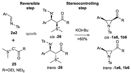- Aggarwal, V.K.; Charmant, J.P.H.; Ciampi, C.; Hornby, J.M.; O’Brien, C.J.; Hynd, G.; Parsons, R. Additions of stabilised and semi-stabilised sulfur ylides to tosyl protected imines: Are they under kinetic or thermodynamic control? J. Chem. Soc. Perkin Trans. 2001, 23, 3159–3166. [Google Scholar] [CrossRef]
