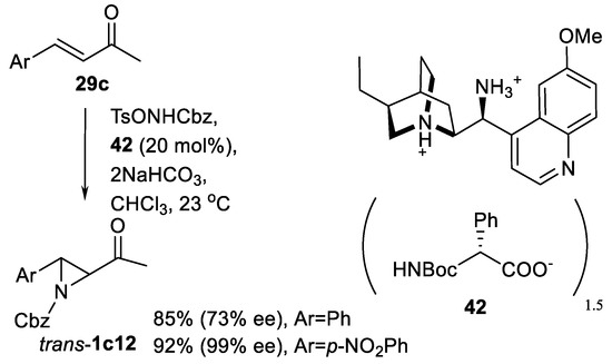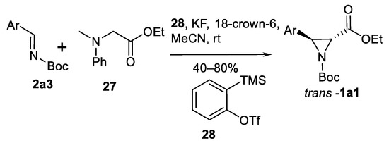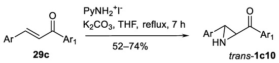 Organocatalytic variations of AZ reaction are also known. In presence of pyridinium salts as Brønsted acid organocatalysts cis-selective synthesis of esters cis-1a was demonstrated [52,53]. The best results show 10 mol% of pyridinium triflate [53]. Synthesis of 21 examples of different 3-aryl aziridine-2-carboxylates 1a bearing substituted phenyls and 2-pyridils in β-position has been demonstrated (70–99% yields). Polymer-supported pyridinium salt also was reported as an effective catalyst (80% yield of product), and three-component one-pot process was performed.