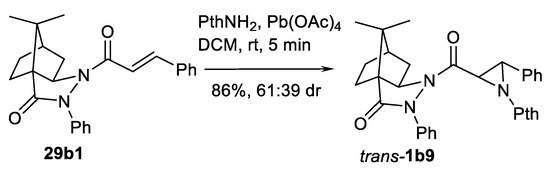 - Yang, K.-S.; Chen, K. A Facile and Highly Diastereoselective Aziridination of Chiral Camphor N-Enoylpyrazolidinones with N-Aminophthalimide. J. Org. Chem. 2001, 66, 1676–1679. [Google Scholar] [CrossRef]