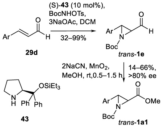 - Arai, H.; Sugaya, N.; Sasaki, N.; Makino, K.; Lectard, S.; Hamada, Y. Enantioselective aziridination reaction of α,β-unsaturated aldehydes using an organocatalyst and tert-butyl N-arenesulfonyloxycarbamates. Tetrahedron Lett. 2009, 50, 3329–3332. [Google Scholar] [CrossRef]