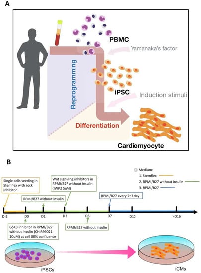 Schemes for hiPSC generation and the differentiation of iCMs. (A) Peripheral blood mononuclear cells (PBMCs) were reprogrammed into hiPSCs via transducing the Yamanaka’s factors, Oct4, Sox2, Klf4, and c-Myc. The resulting hiPSCs were then subjected to cardiac induction. (B) Functional mature iCMs with beating characteristics can be obtained at 16 days post-induction using the defined protocol of cardiac induction.